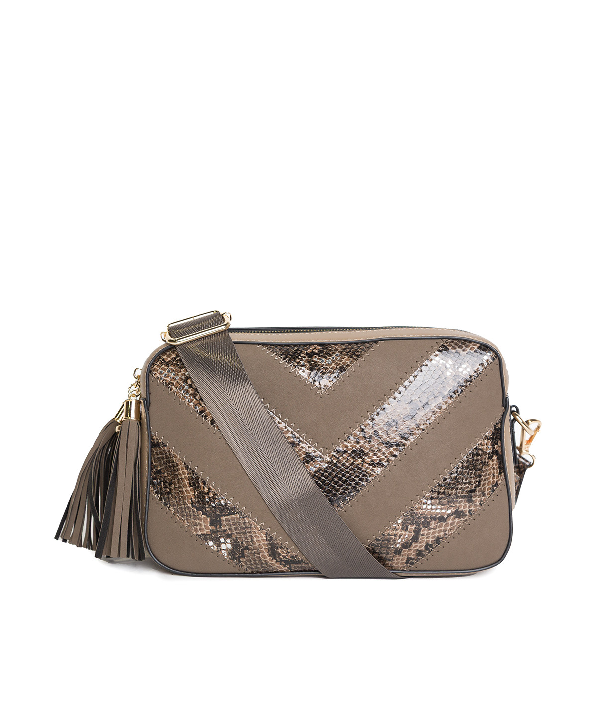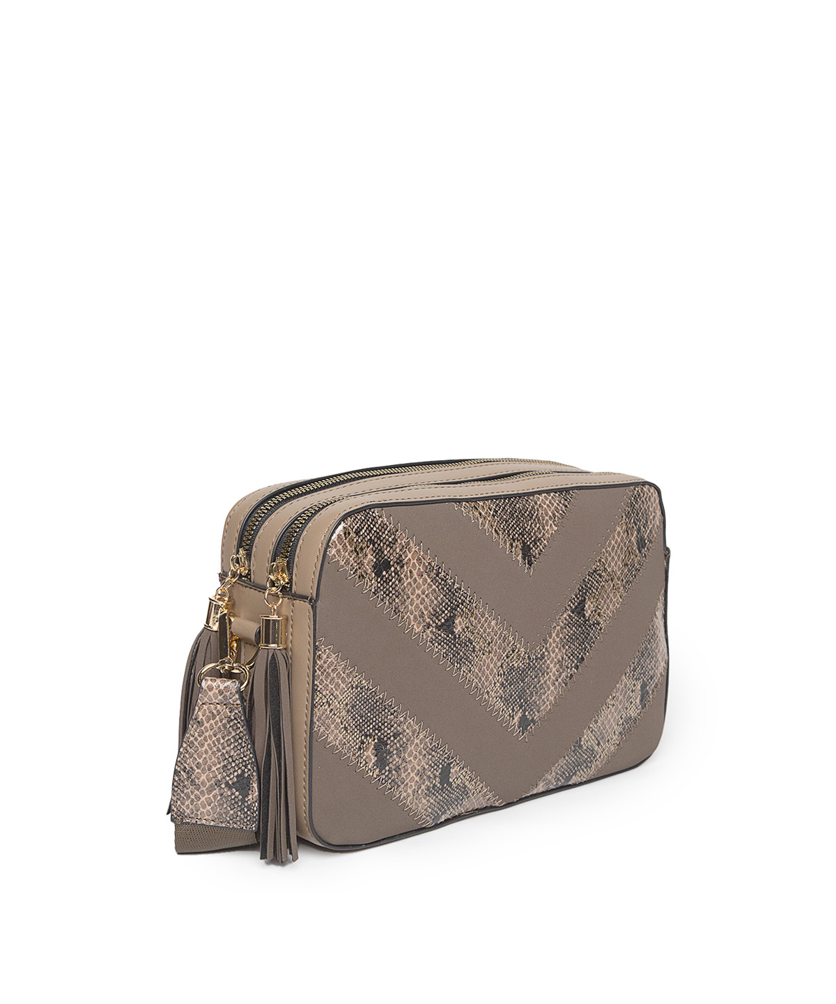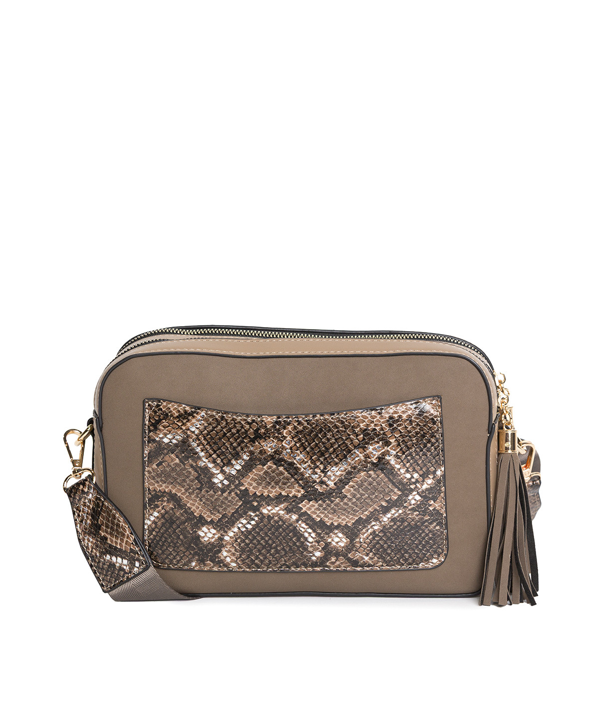 Bandolera tipo “camera” en antelina con dibujos geométricos en serpiente con sutil dorado, doble cremallera y borla y bolsillo en parte trasera, en un color: beige, una pieza. Medidas: 26 x 17 x 8 cm.. Composición: Ext: 100% PU. Int: 100% poliéster.