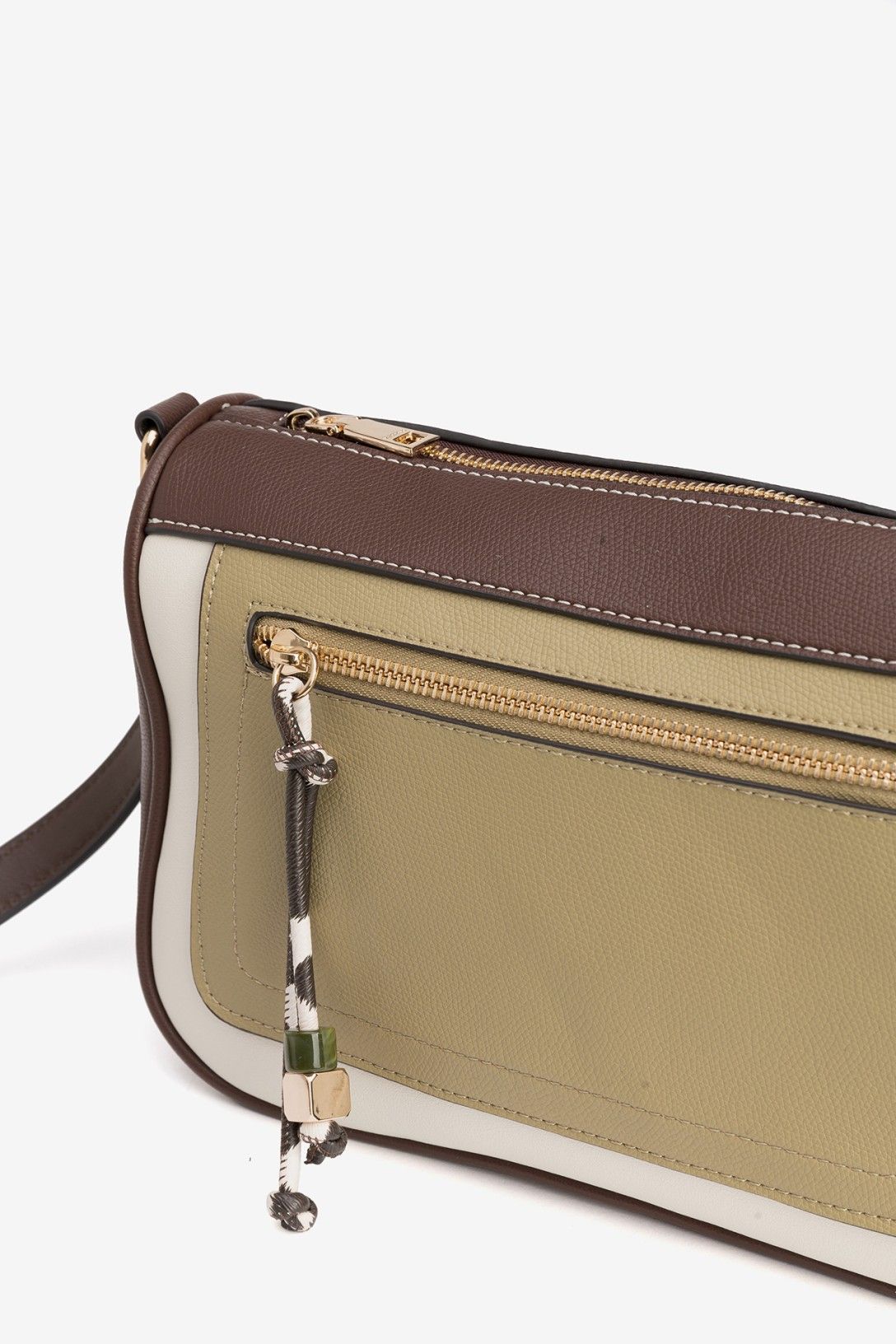 Bandolera de color verde, marrón y crema, con cremallera dorada y detalle de llavero colgante.
