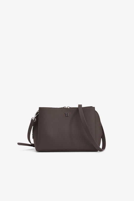 Bolso bandolera efecto piel con tres compartimentos, cierres magnéticos laterales y cierre superior de cremallera. Correa bandolera ajustable y desmontable. Bolsillo interior con cremallera.