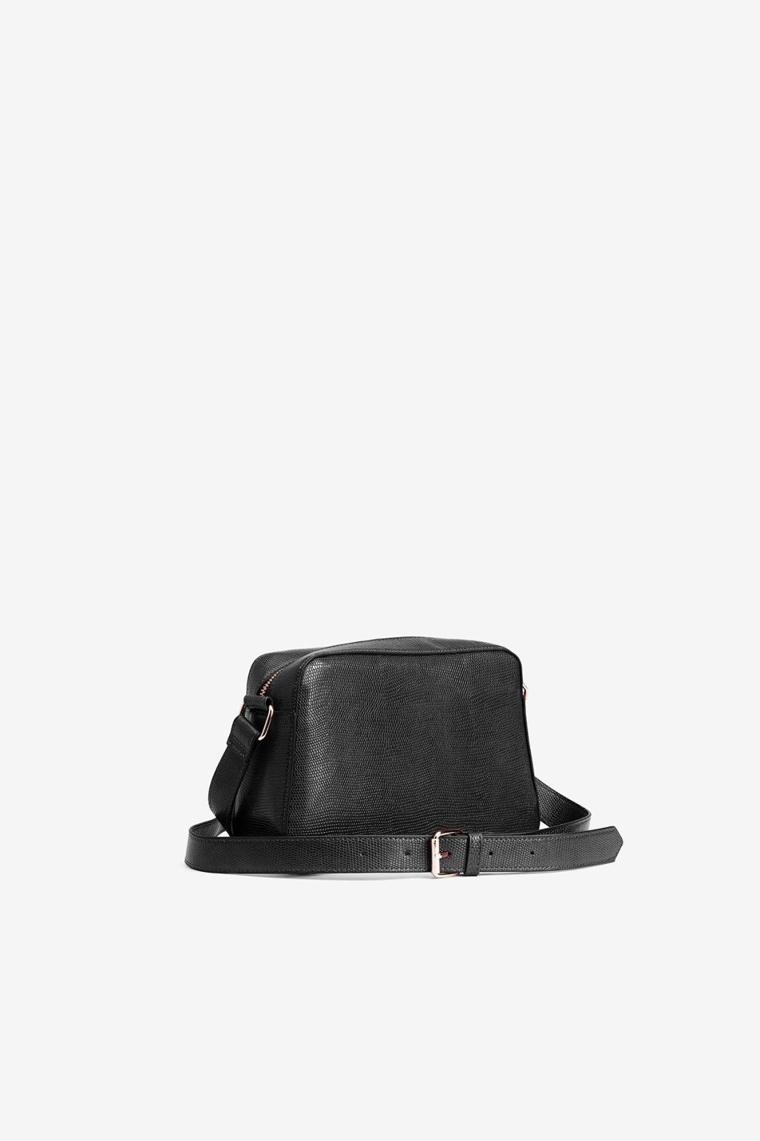 Bolso negro con textura granulada, cierre de cremallera dorada y correa ajustable para comodidad.