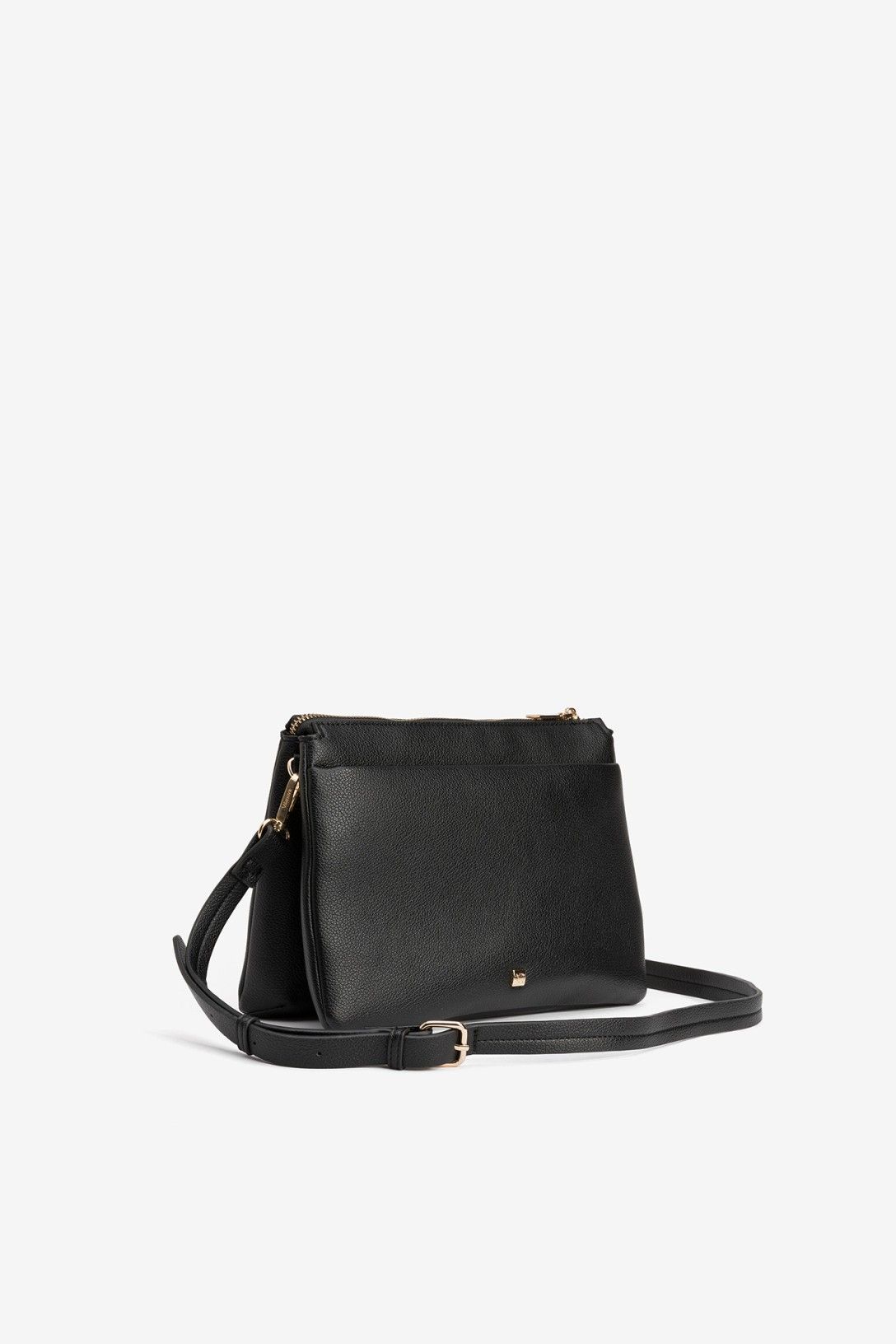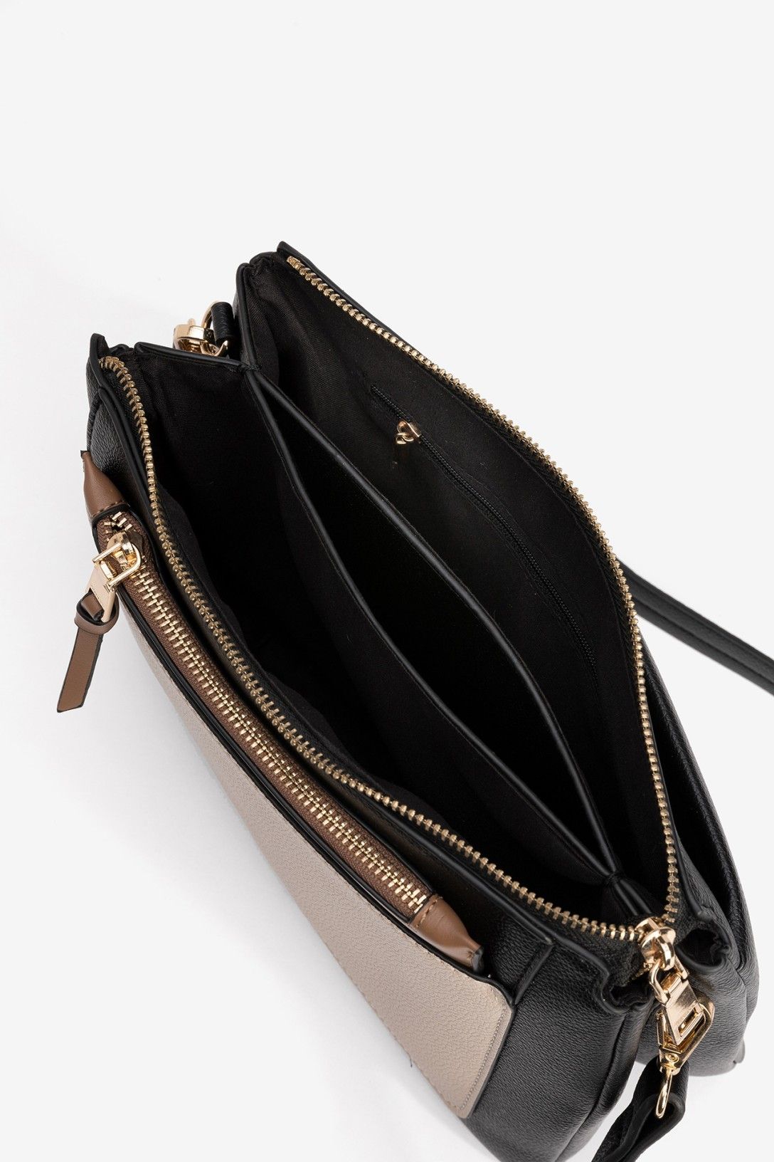 Cartera en negro y beige con cremalleras doradas y compartimentos prácticos para organización diaria.