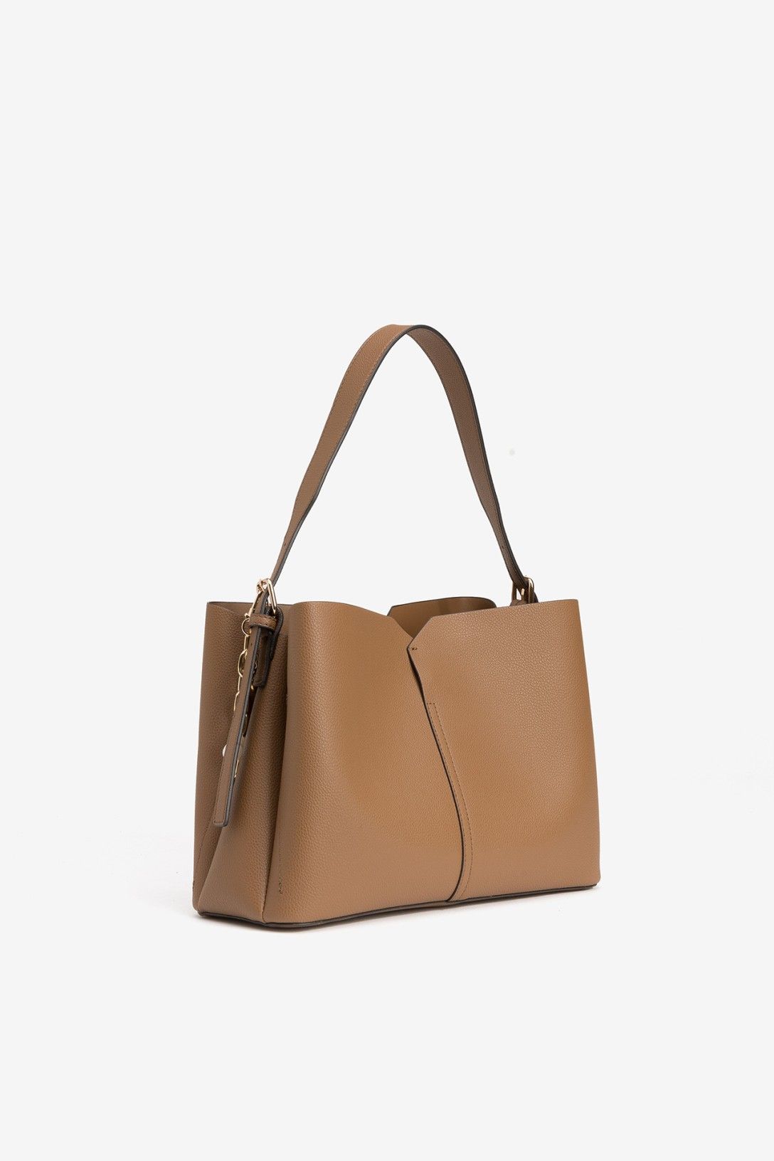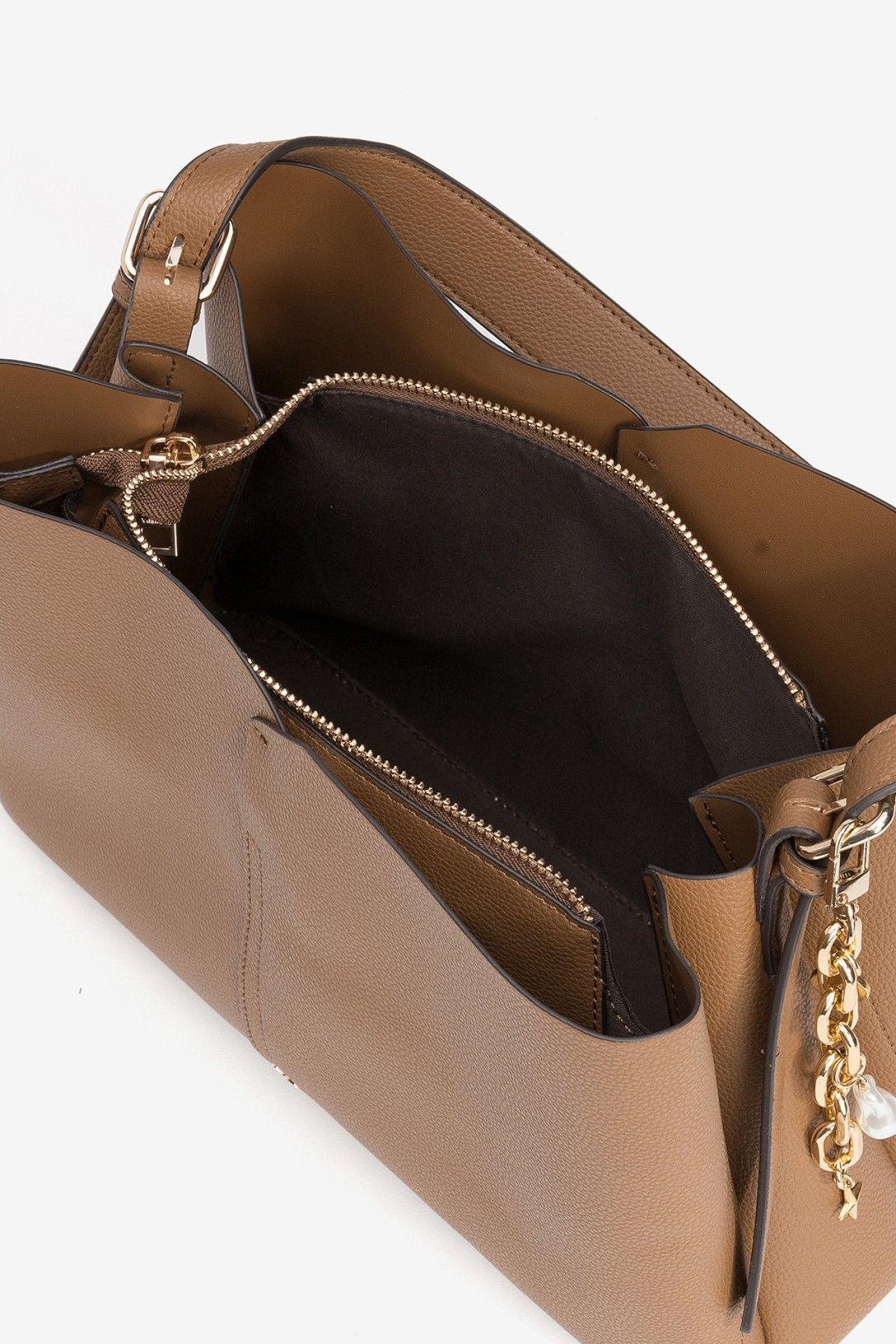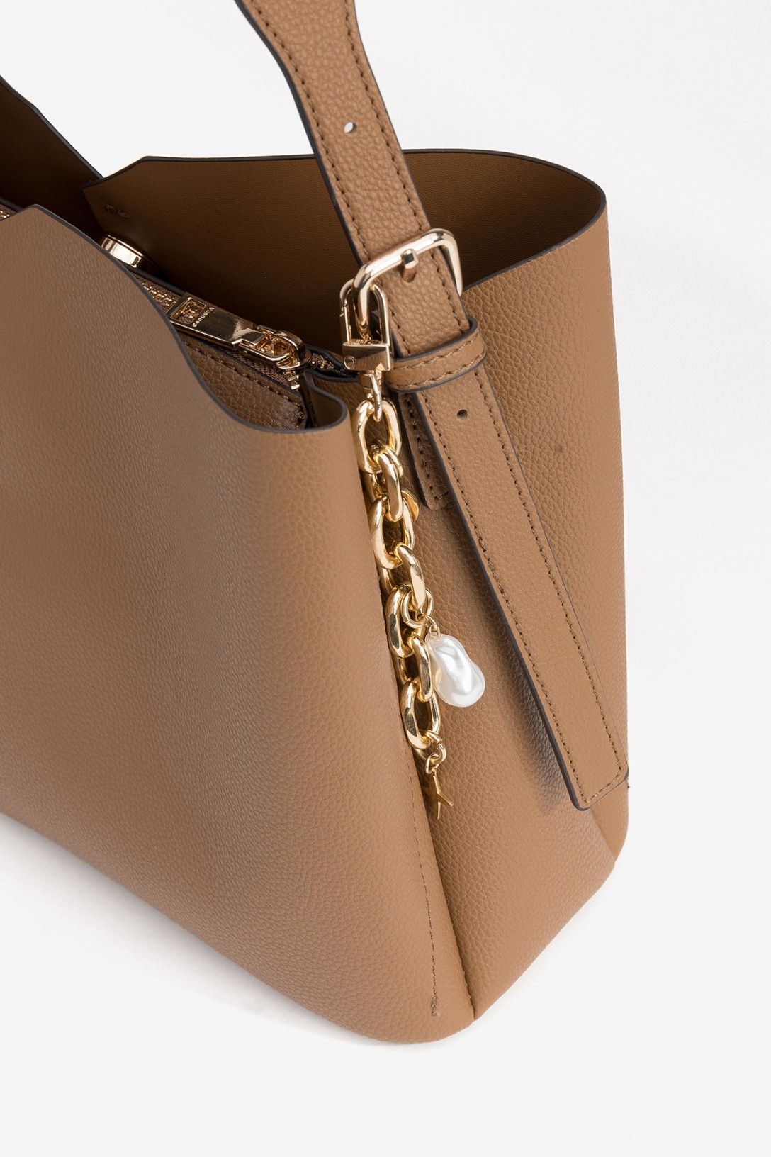 Bolso camel de corte estructurado con asa gruesa, detalle de cadena dorada y cierre de cremallera.