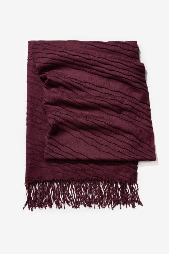 Bufanda Burdeos suave con textura plisada y franjas delicadas con flecos.