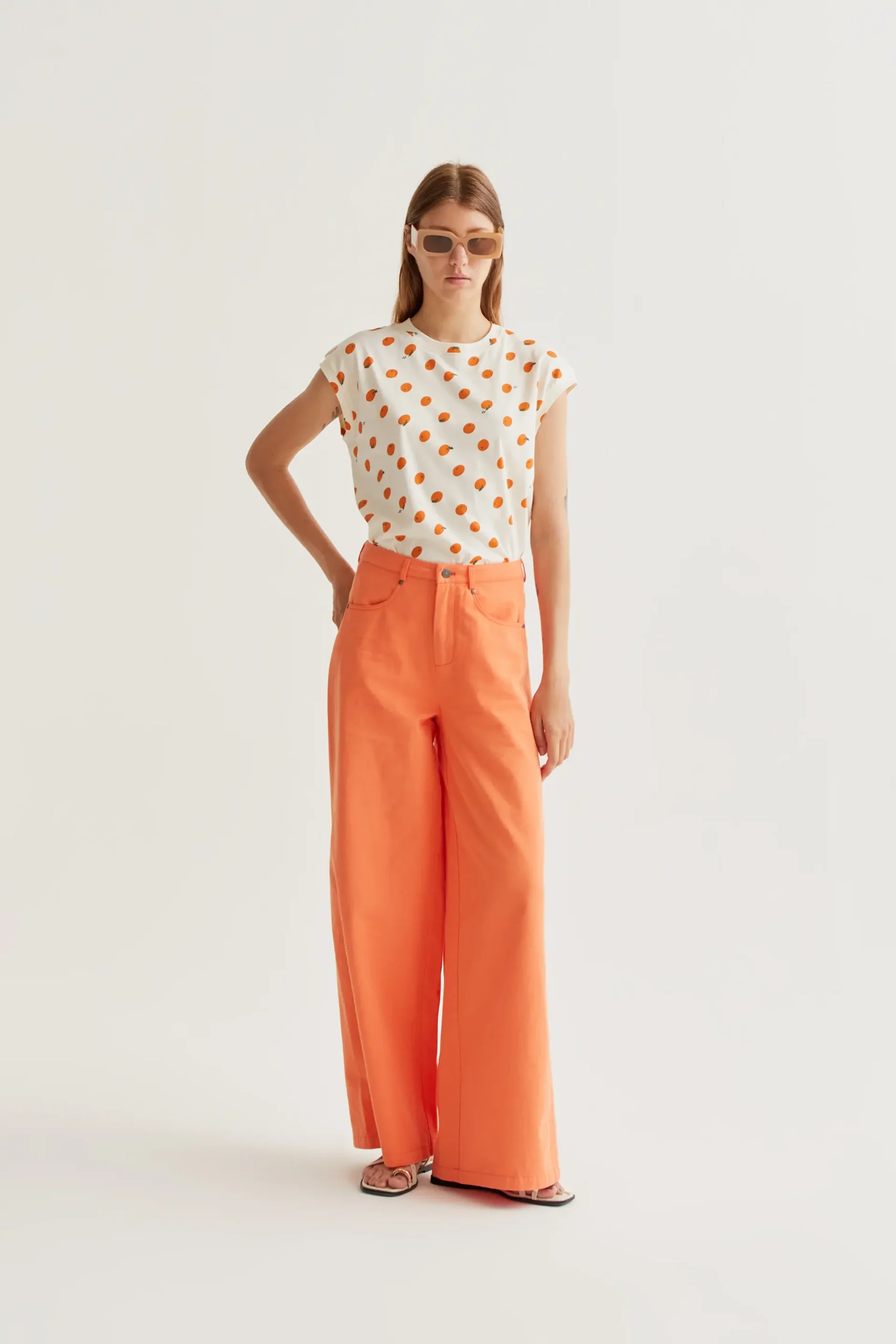 Camiseta de tejido 100% algodón con estampado de naranjitas. Cuello redondo y manga corta. Hombro ligeramente caído. La modelo mide 175 cm y lleva la talla S