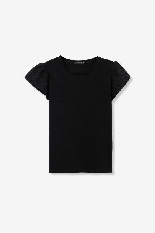 Camiseta de algodón negra con manga avolantada. 100% Algodón.
