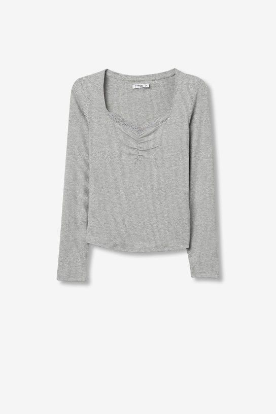 Camisetas super slim fit, de punto canalé, con fruncido frontal y detalle de encaje. Escote cuadrado y manga larga.