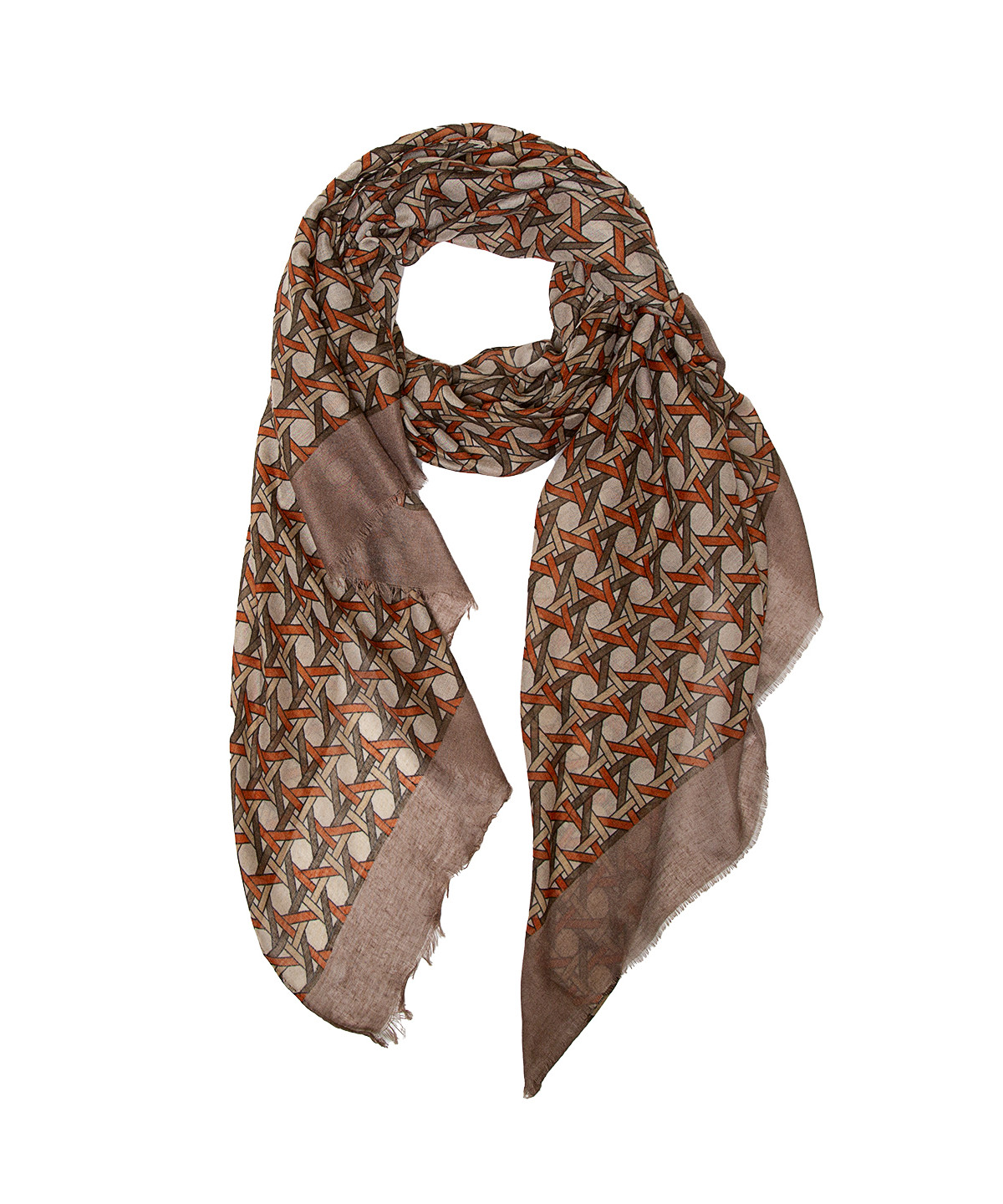 Foulard en tacto suave con fleco en dos lados. con dibujo geométrico entrelazado. en colores otoñales. en dos colores: verde. marrón. dos piezas surtidas. Medidas: 80 x 180 cm. Composición: 100º/ₒ poliéster.