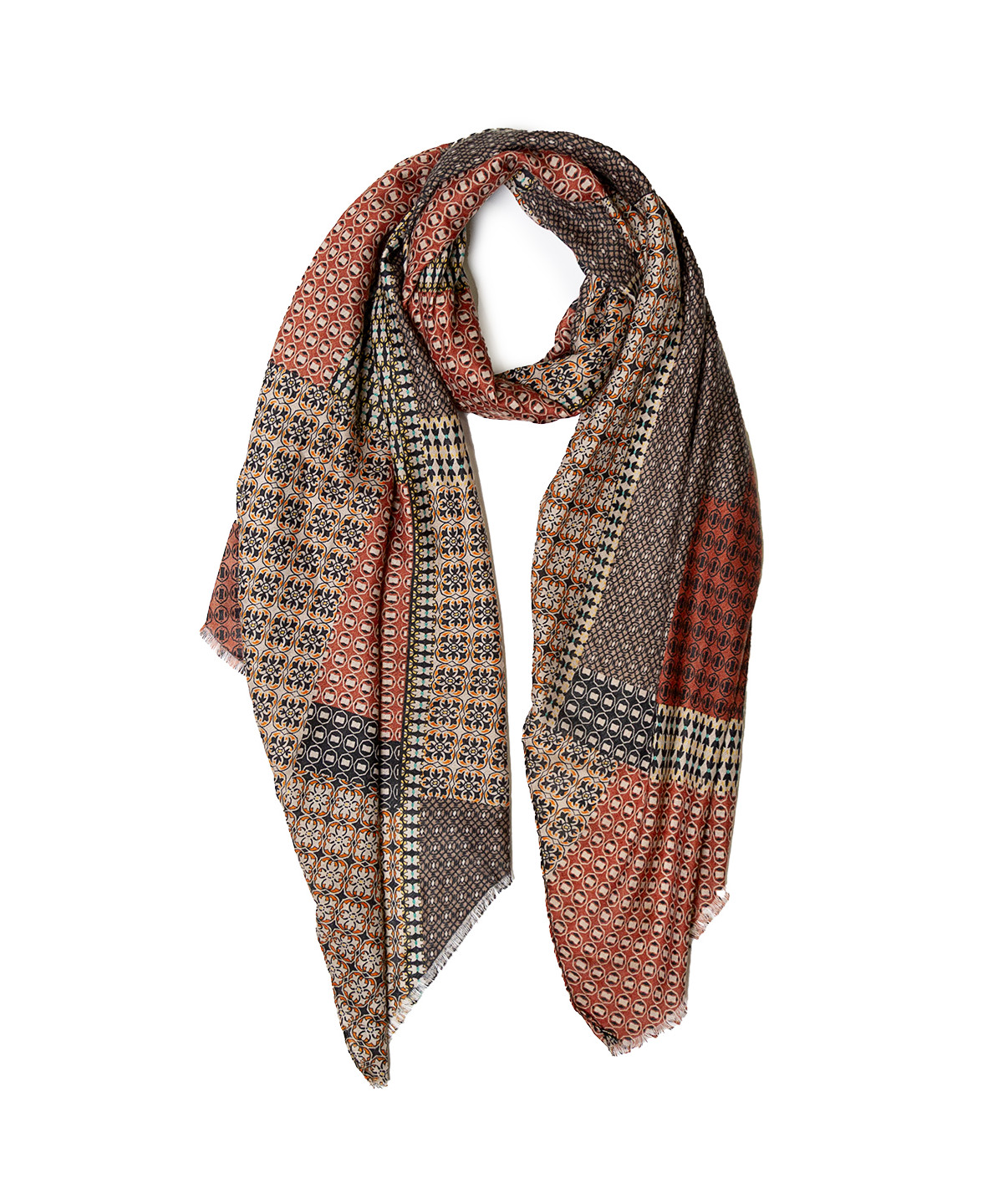 Fular en tacto suave con fleco en dos lados. con dibujo de parches en diferentes estampados en pequeños motivos tipo mosaico. en dos colores: marrón. verde. dos piezas surtidas. Medidas: 85 x 180 cm. Composición: 100º/ₒ Poliéster.