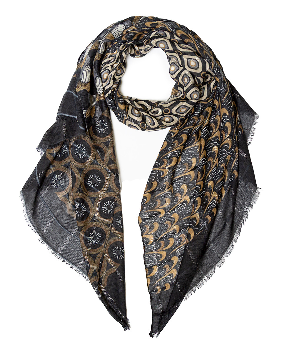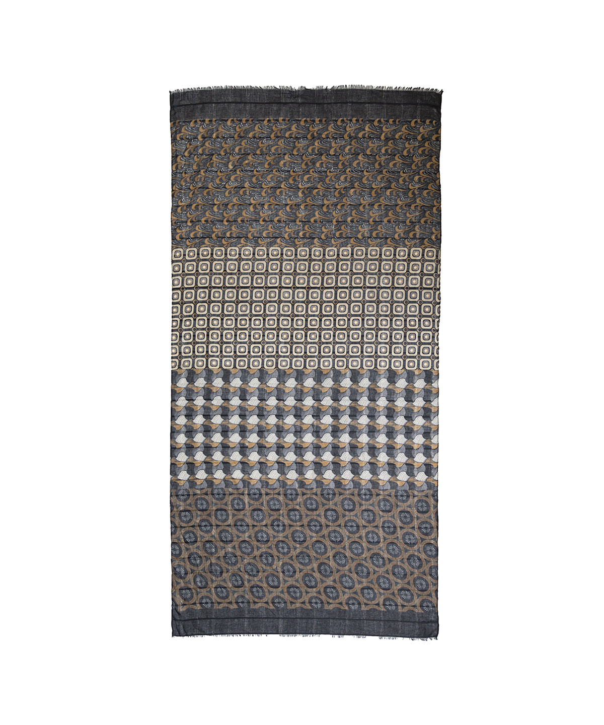 Foulard en tacto suave con fleco en dos lados. con dibujo a franjas de diferentes estampados tipo papel pintado. en un color: gris. una pieza. Medidas: 85 x 180 cm. Composición: 100º/ₒ poliéster.