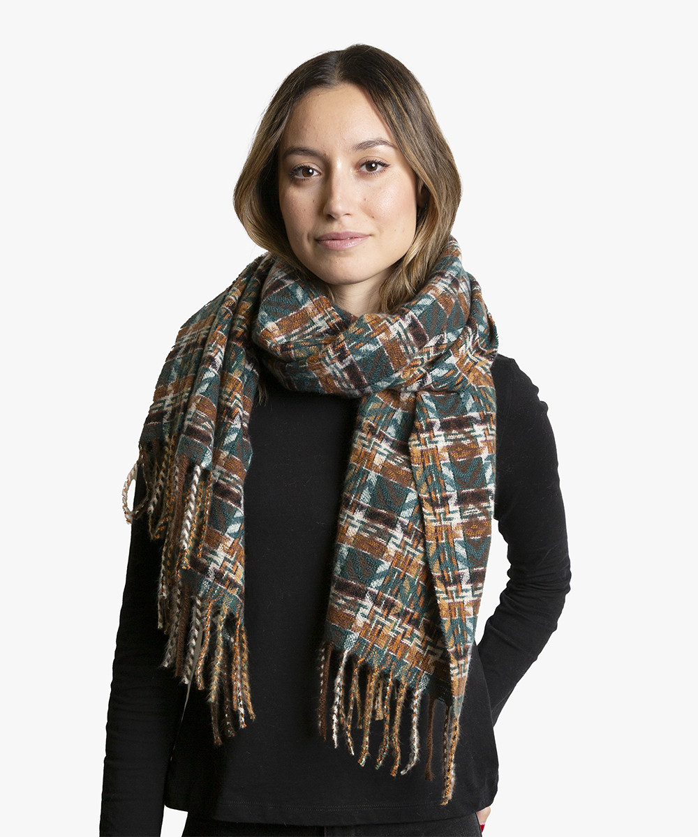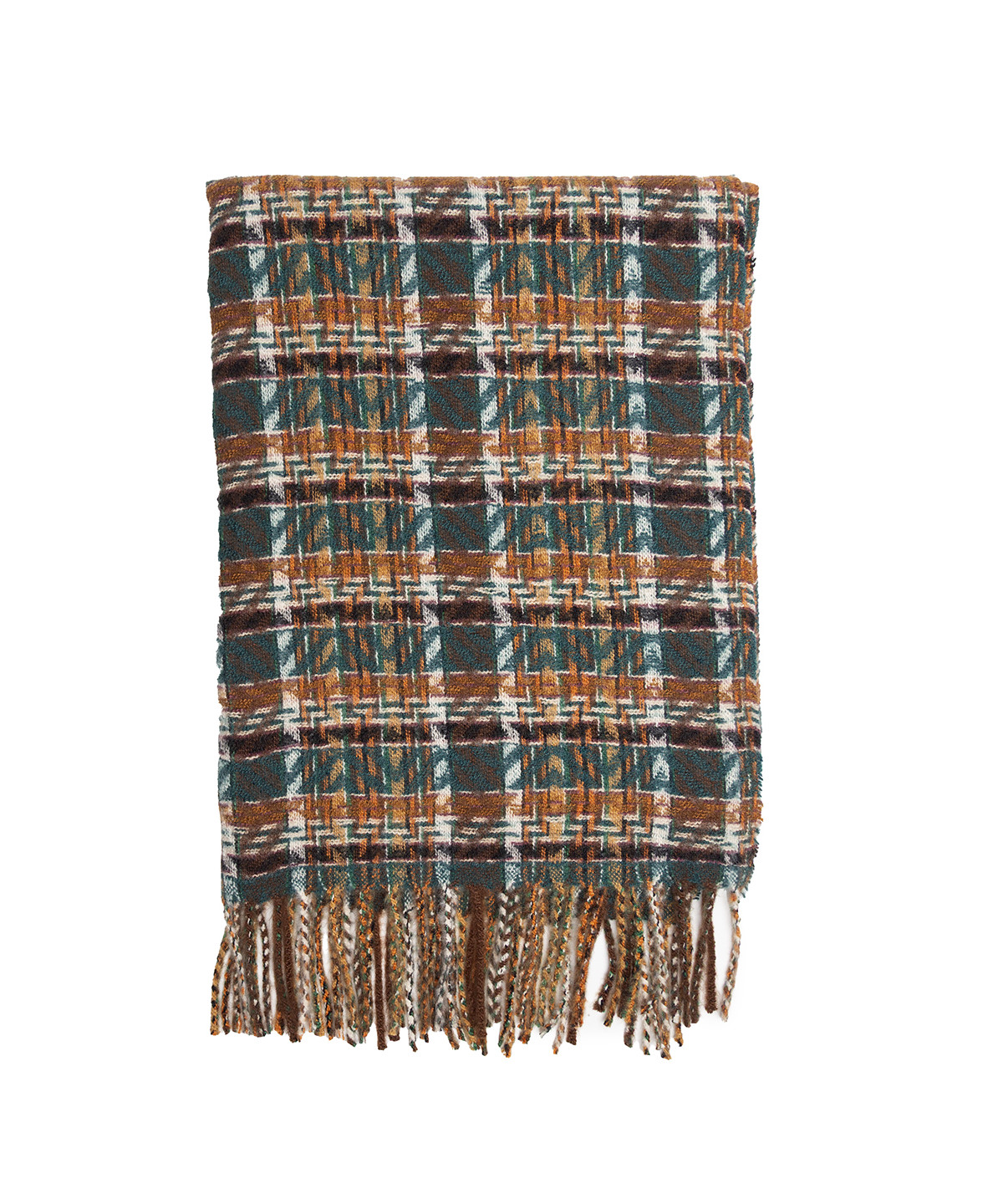 Manta extra suave y abrigada con dos lados de flecos en cuadros de jacquard. en un color: marrones y verdes. una pieza. Medidas: 65 x 180 cm + flecos. Composición: 100º/ₒ poliéster.