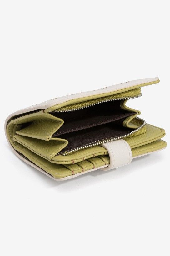 Monedero beige con diseño perforado, interior verde, cierre de cremallera y varios compartimentos.