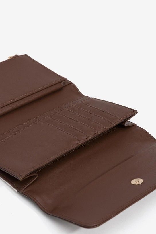 Monedero de efecto piel, con solapa, botón de presión, cierre de cremallera superior y asa fija. Interior con siete compartimentos para tarjetas, cuatro para billetes, un compartimento transparente y un bolsillo con cierre de cremallera.