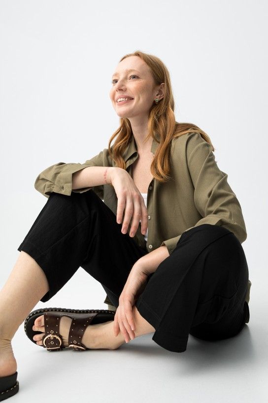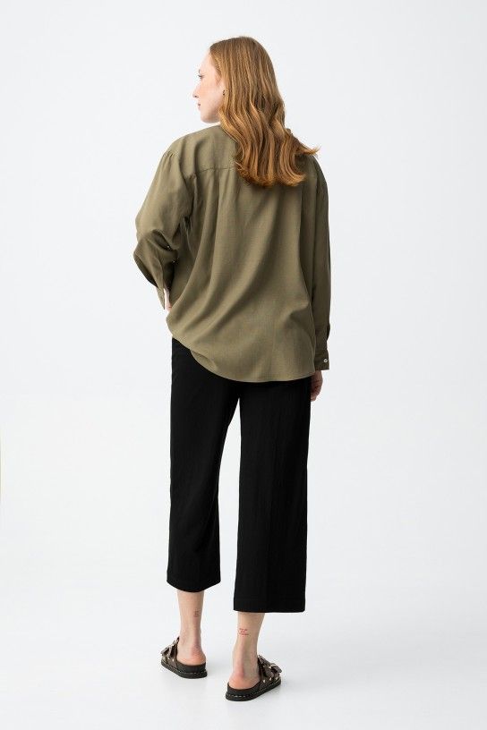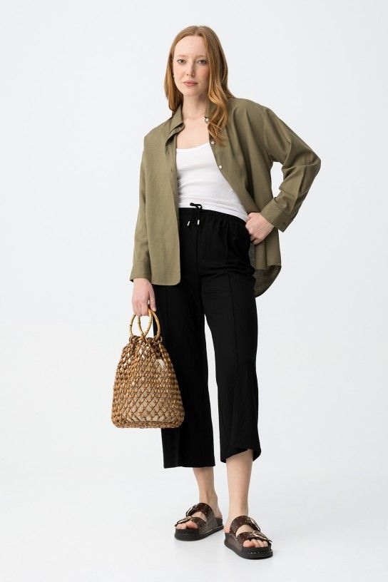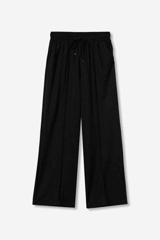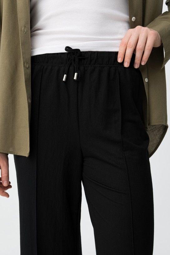 Pantalones de corte amplio en tono negro con cintura elástica y cordón ajustable para mayor comodidad.