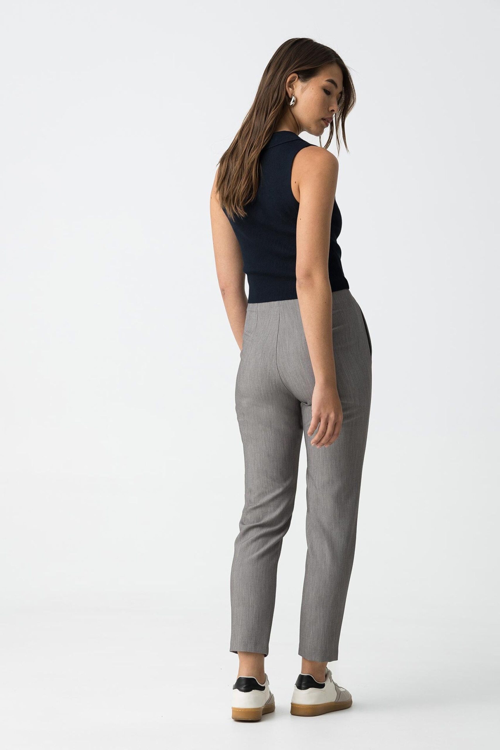 Pantalón de tiro alto con falsos bolsillos laterales.Cierre frontal con cremallera, gancho y botón en el interior.