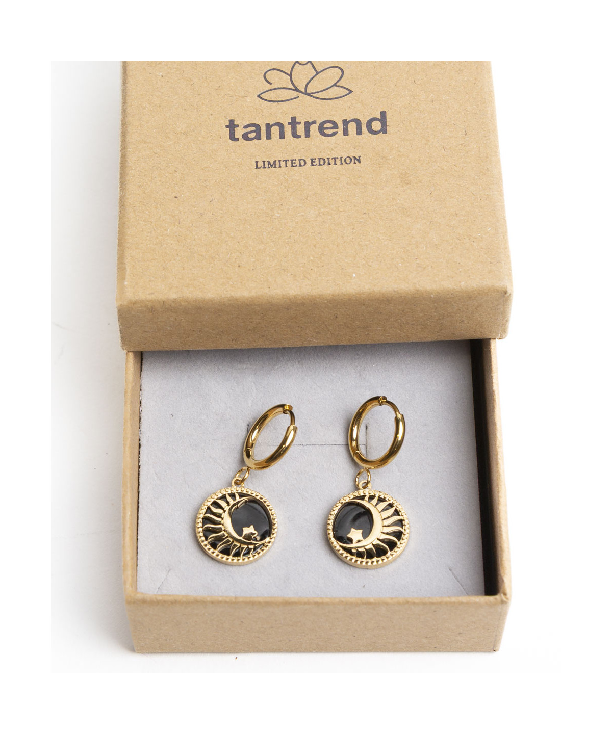 Pendiente de arito con colgante de luna calada en redondel con piedra en negro. de acero inoxidable con baño de oro de 14 kilates. en un color: dorado. una pieza. Medidas: 1.5 cm. Composición: acrílico. acero inoxidable.