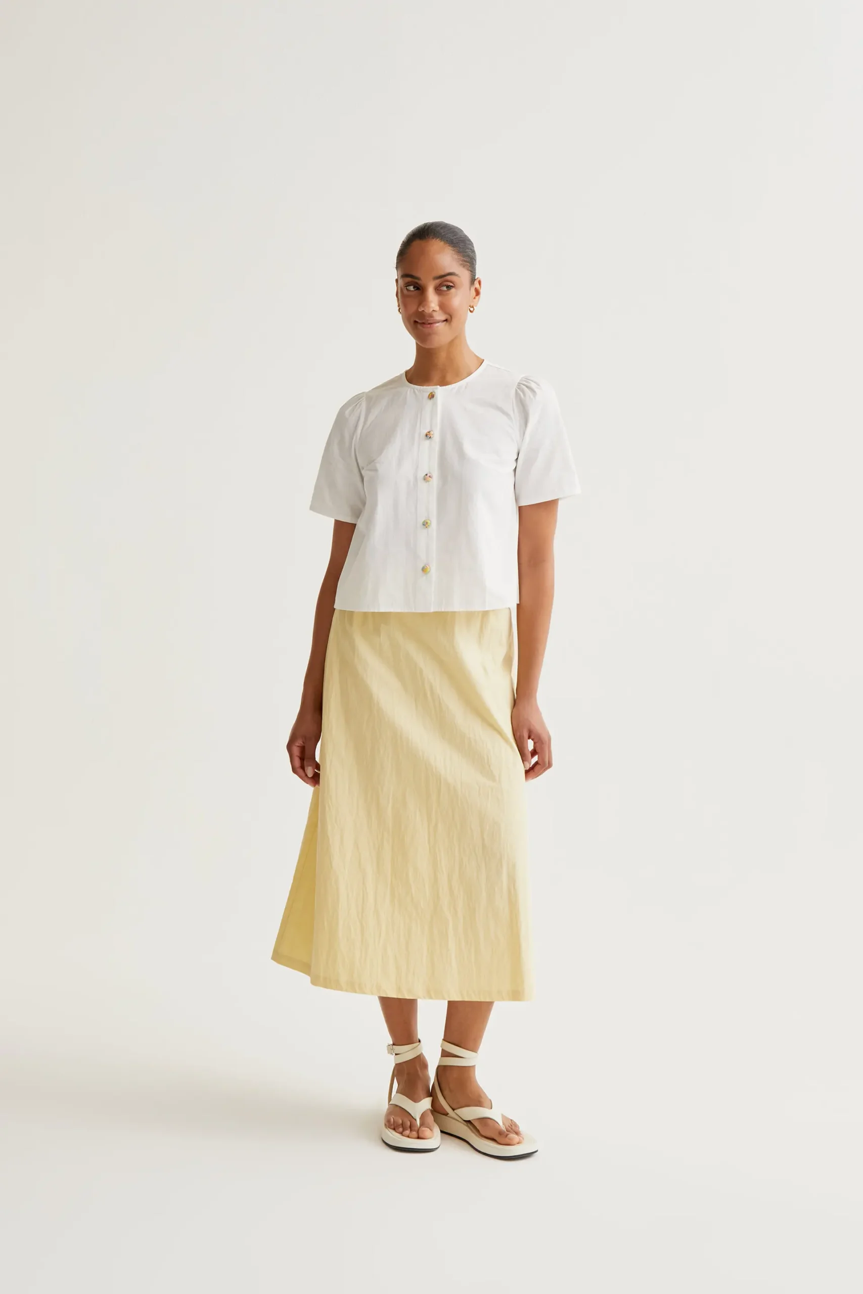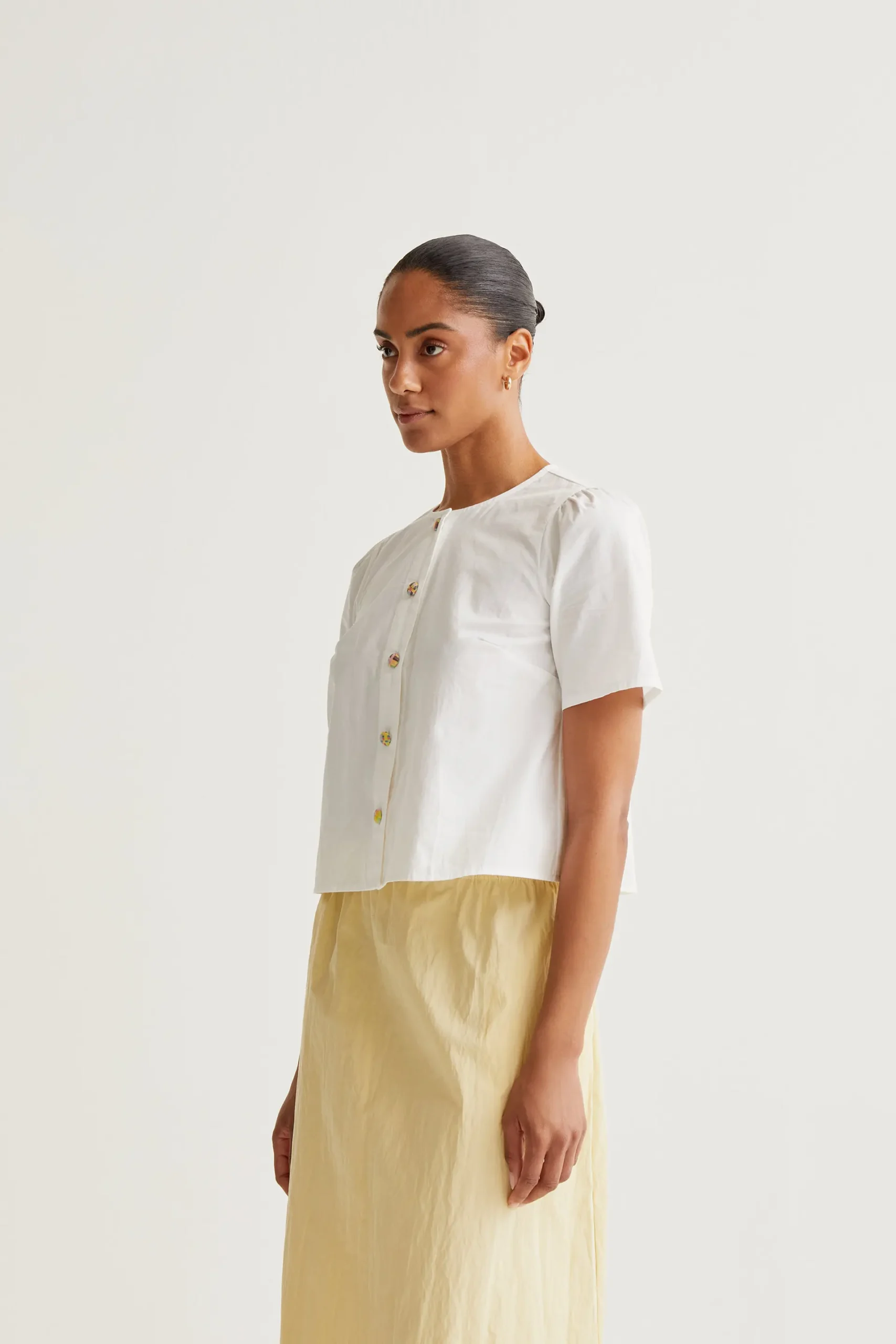 Top de tejido 100% algodón de color blanco. Cuello redondo y manga corta ligeramente abullonada. Cierre frontal con botones multicolor. La modelo mide 175 cm y lleva la talla S.