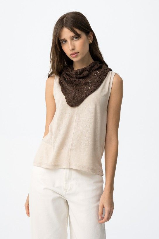 Top con lazada en hombros color beige y escote pico.