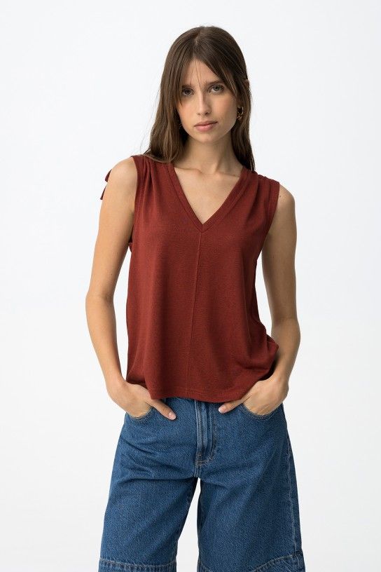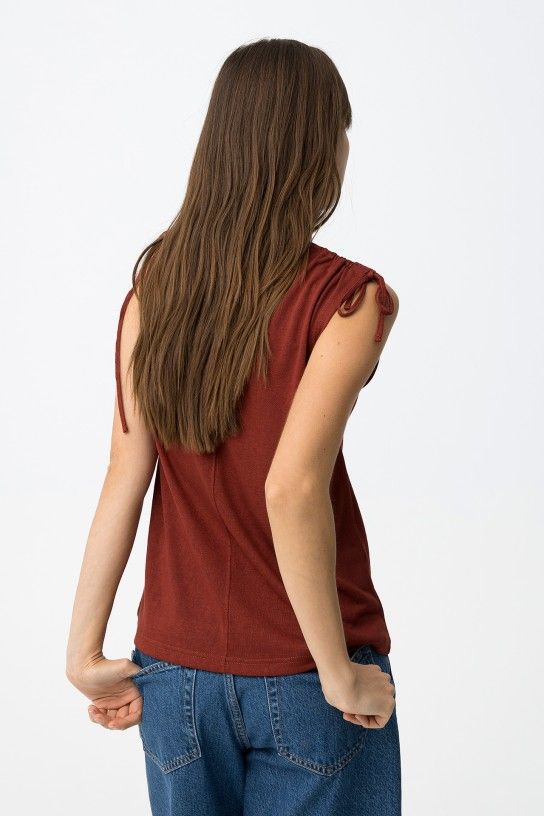 Top con lazada en hombros color burdeos. Escote pico.