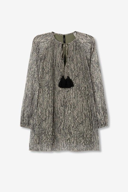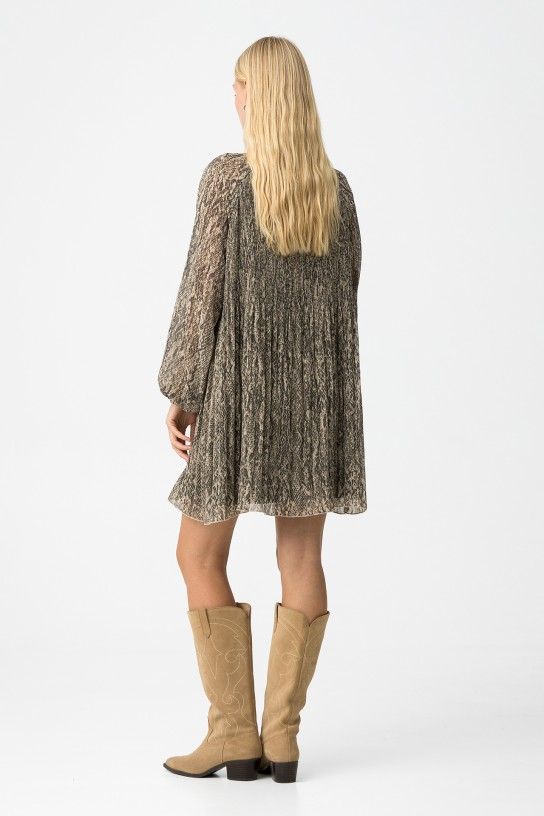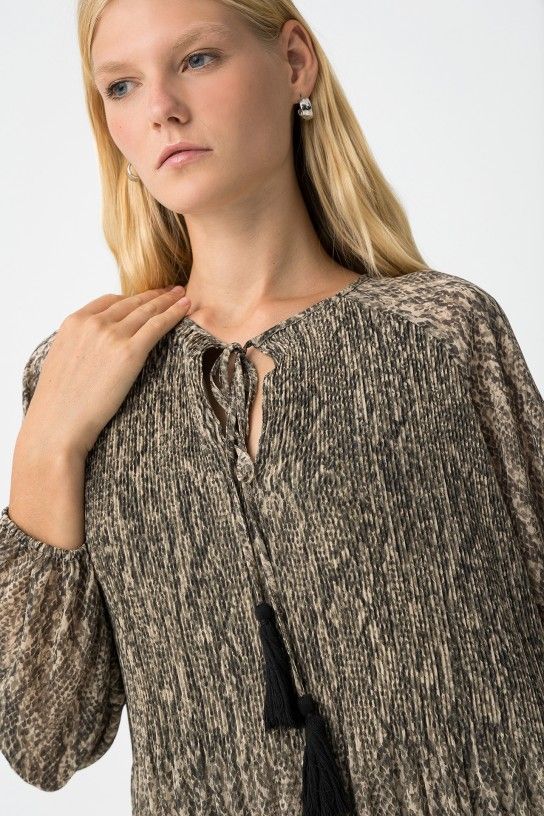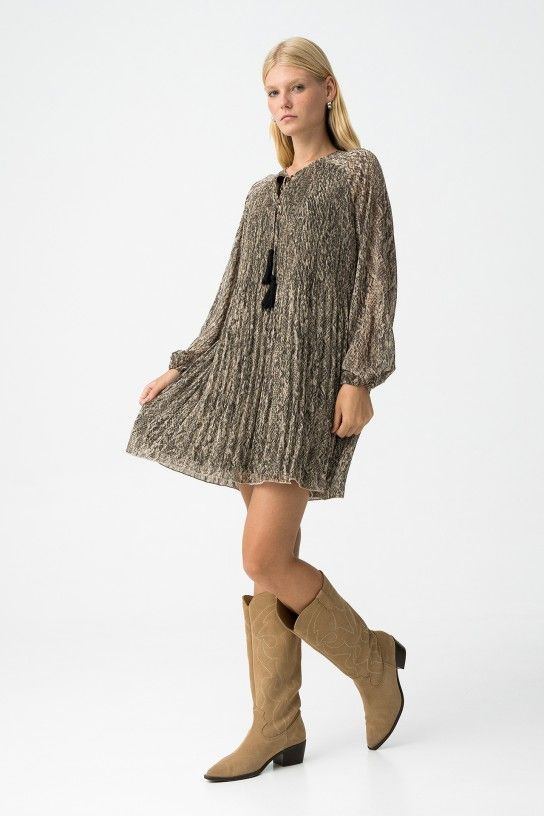 Vestido corto de corte regular con plisado y estampado all over. Cuello redondo con cordón y detalle de flecos. Manga larga con puños elásticos. Interior forrado.